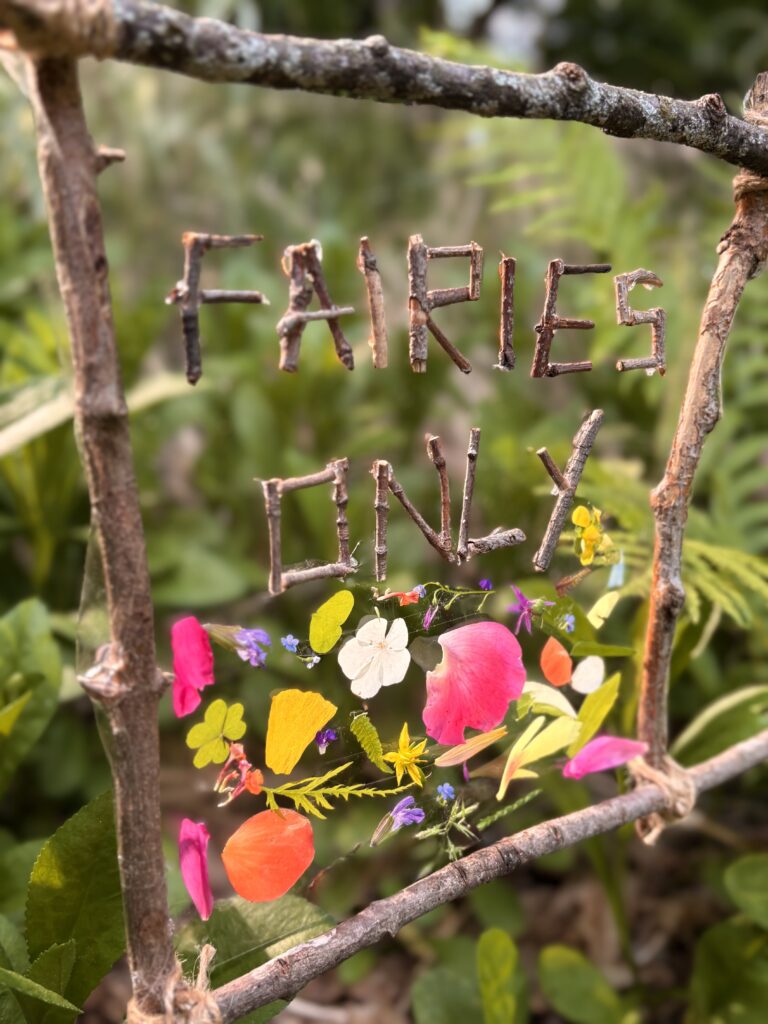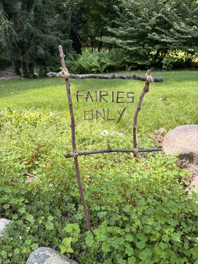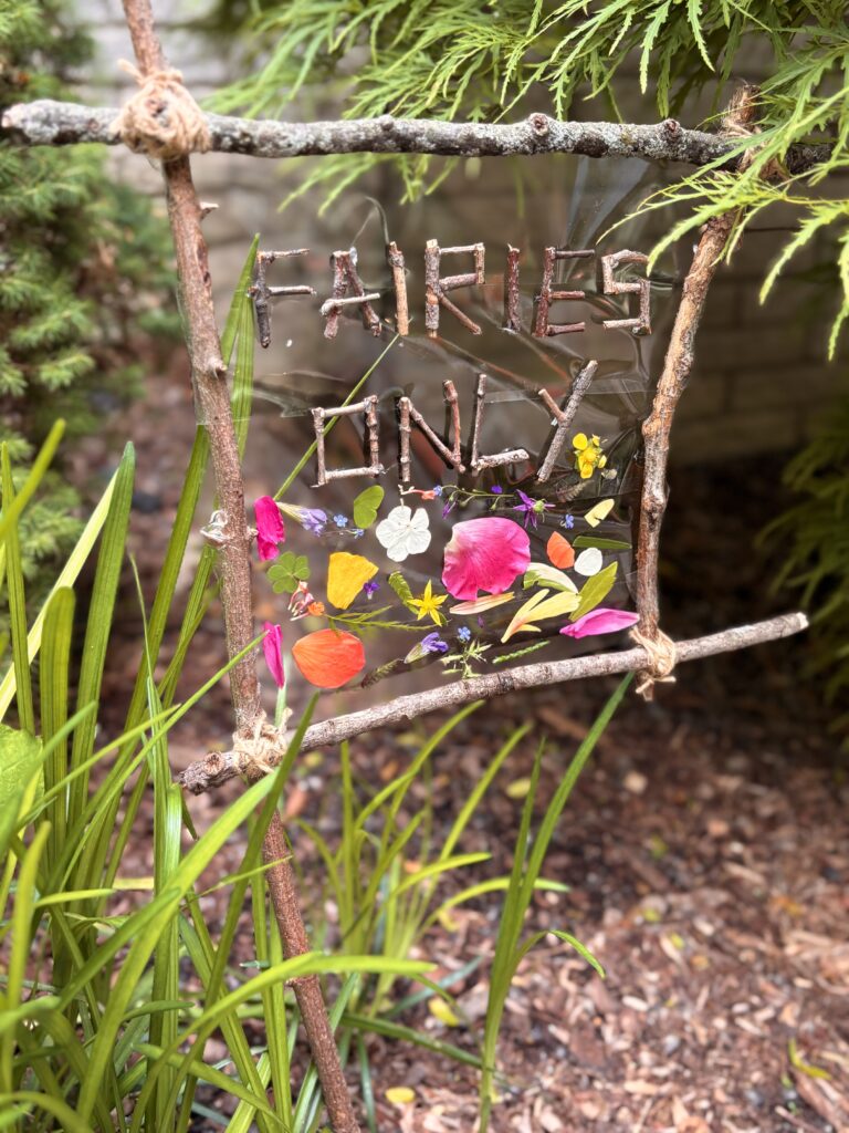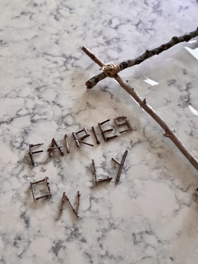 DIY nature fairy garden sign for kids. My four year old has been busy building a little fairy garden in our backyard and we needed a sign to complete the look. We foraged sticks from the yard, wrapped with twine, and hot glued little sticks to make letters. I was out of clear contact paper, so we used packing tape on the back of the sign. Really cute and fun!