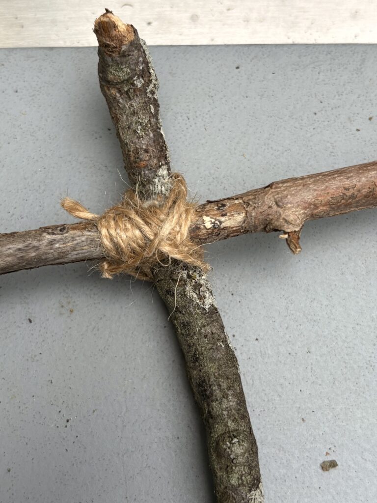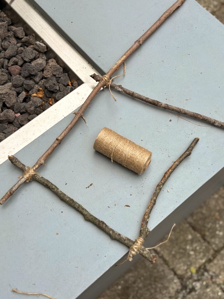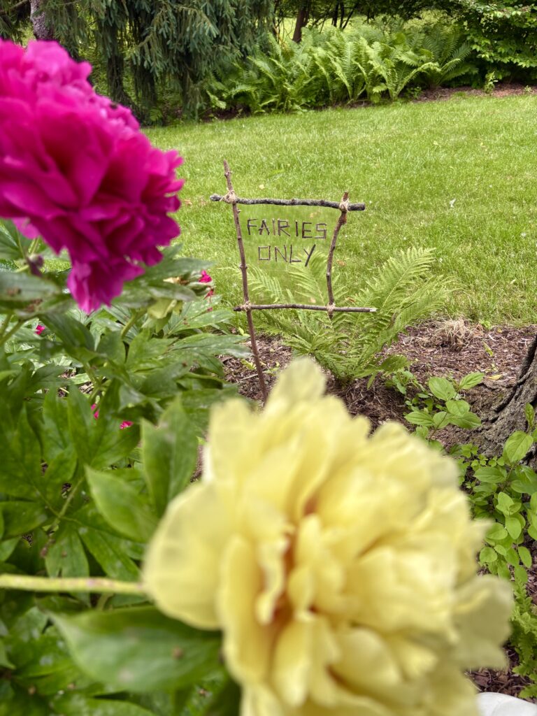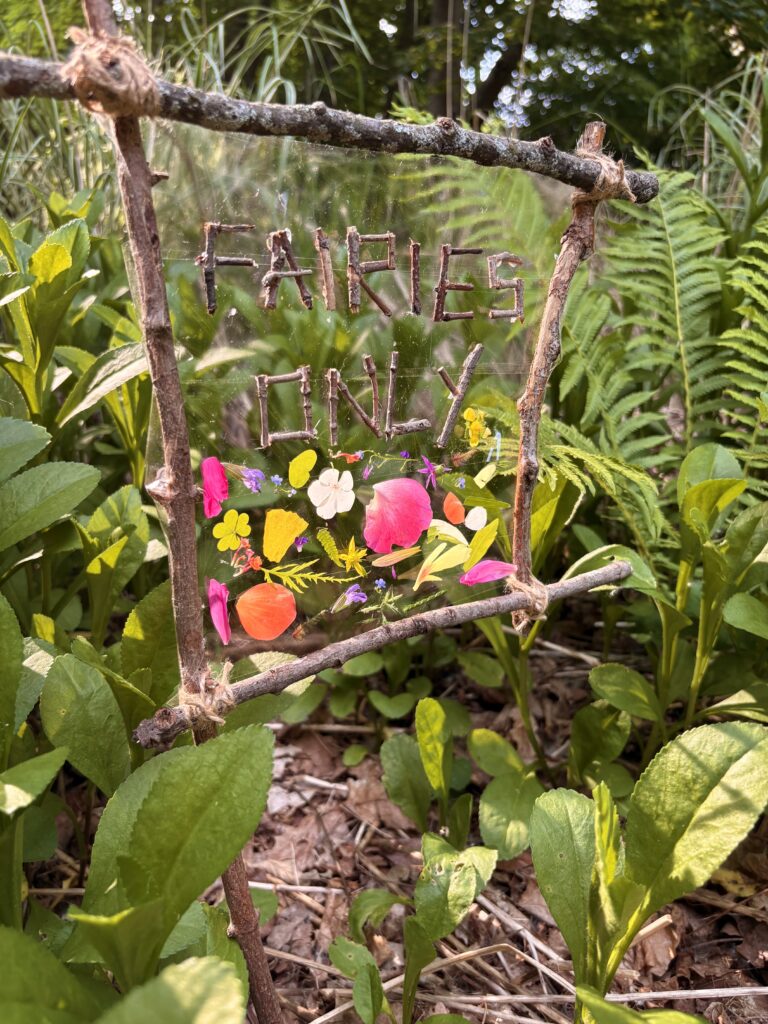 DIY nature fairy garden sign for kids. My four year old has been busy building a little fairy garden in our backyard and we needed a sign to complete the look. We foraged sticks from the yard, wrapped with twine, and hot glued little sticks to make letters. I was out of clear contact paper, so we used packing tape on the back of the sign. Really cute and fun!
