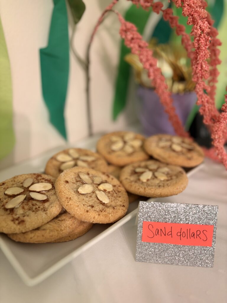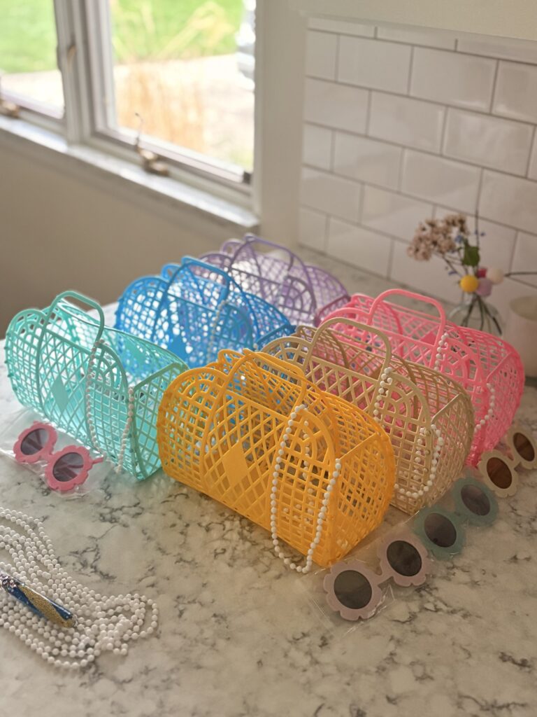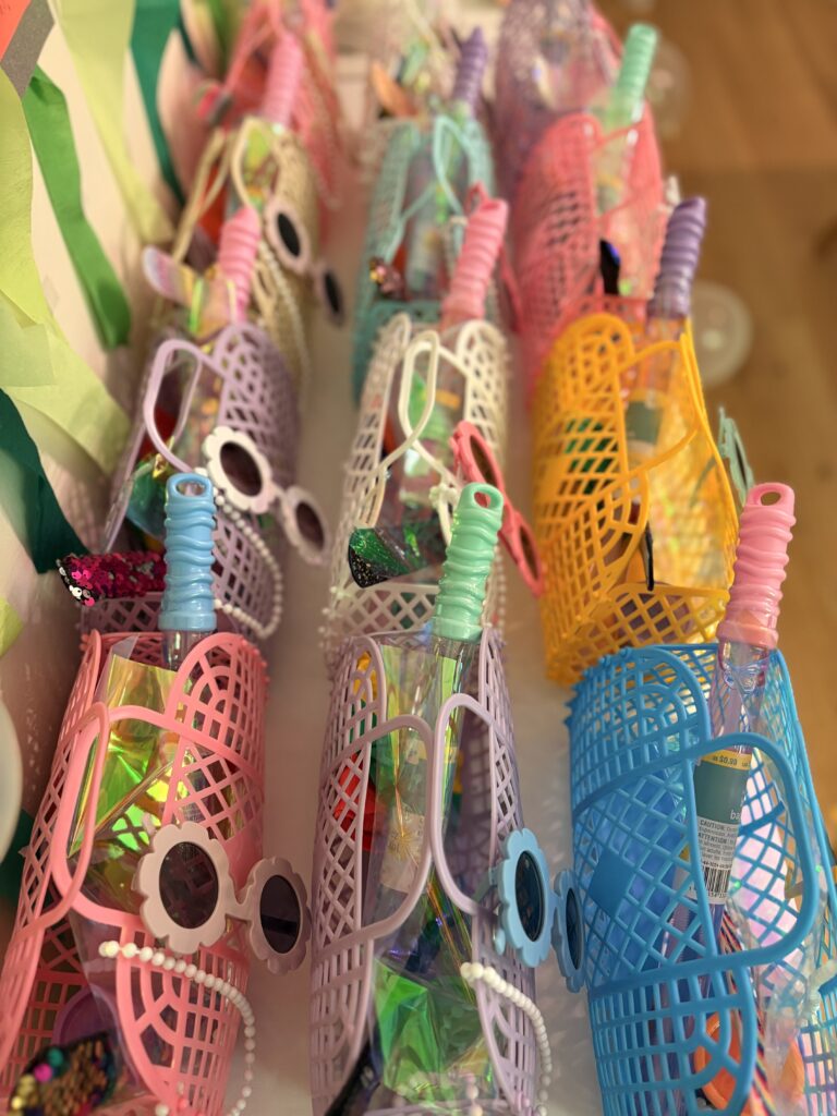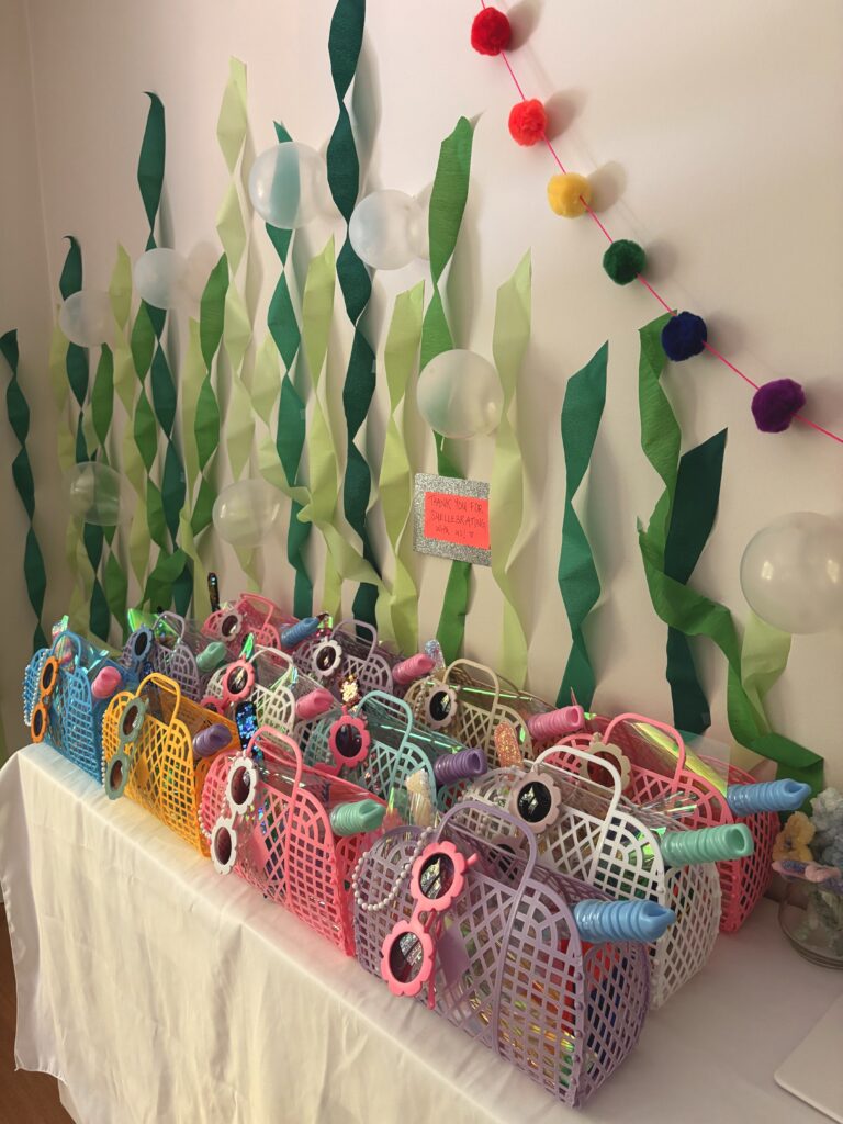 We did some really cute mermaid gift bags for the kids (ages from 2-5). I used these colorful beach jelly bags that came with kids sunglasses and filled them with sequin slap bracelets, beach balls, play doh, pearl necklaces and bubbles.