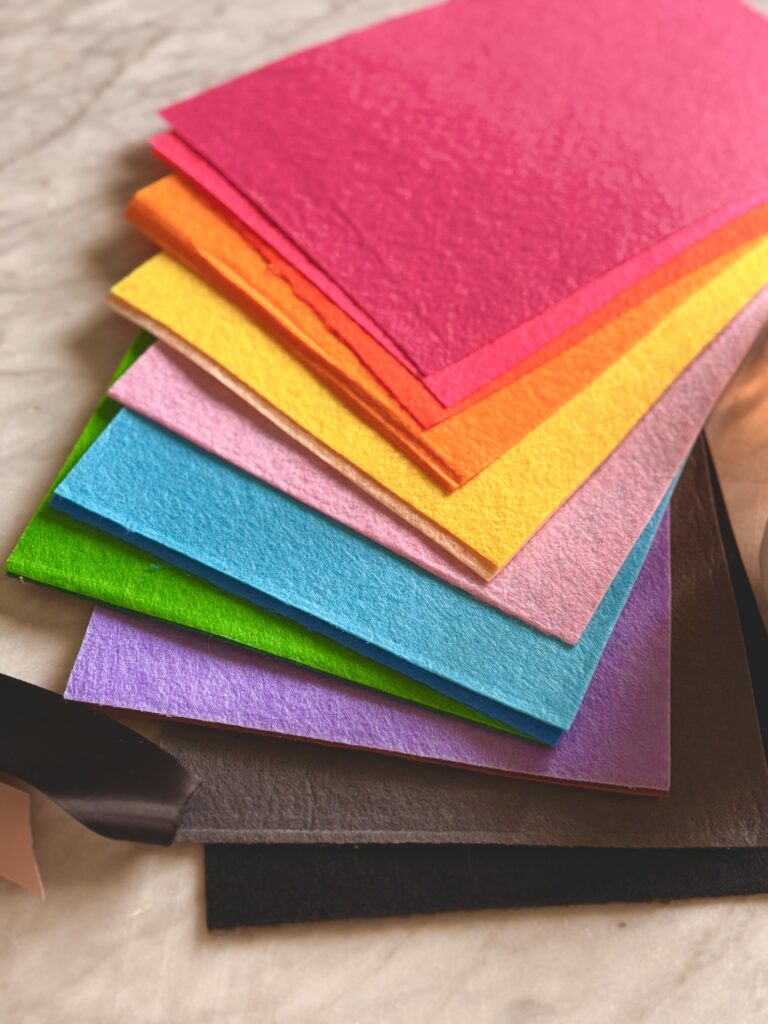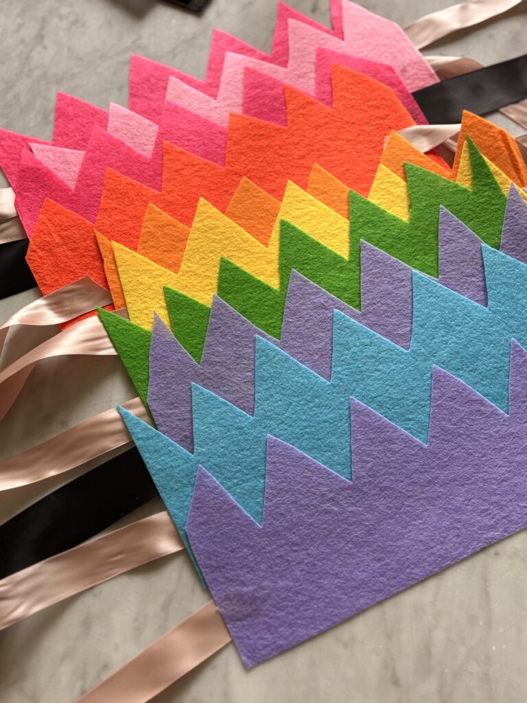 We did so many mermaid themed crafts. One was these “decorate a mermaid crown” made of colorful felt cut into crown shapes and 1 – 1 1/2 inch ribbon that I hot glued onto the backside of the crown. The kids decorated the crowns with sticker jewels and glitter sea animal foam stickers.
