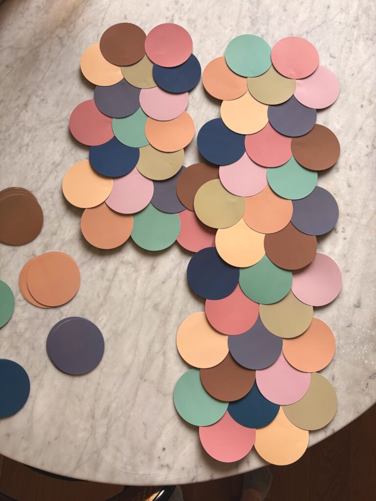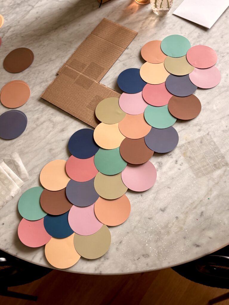 I DIY’d the mermaid tail number 4 with some cardboard taped together and these circle cutouts for the scales.