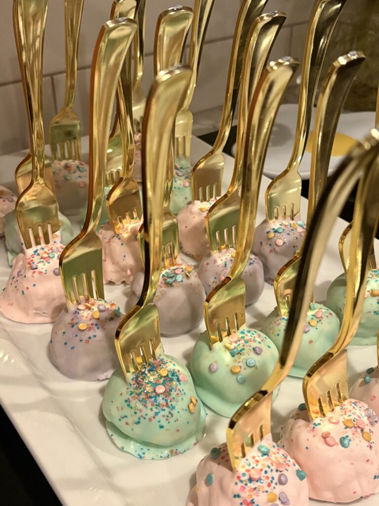 Dinglehopper cake pops! And other fun mermaid / ocean themed party snacks. Sand dollar cookies, coral rock candy, seaweed dip, shark fin chips, mermaid mimosas with iridescent edible glitter