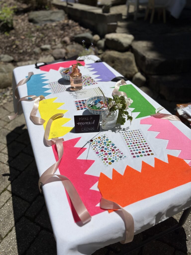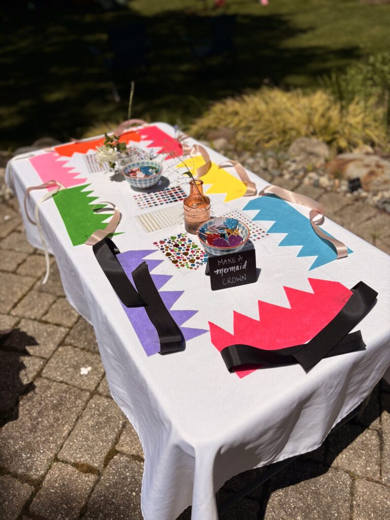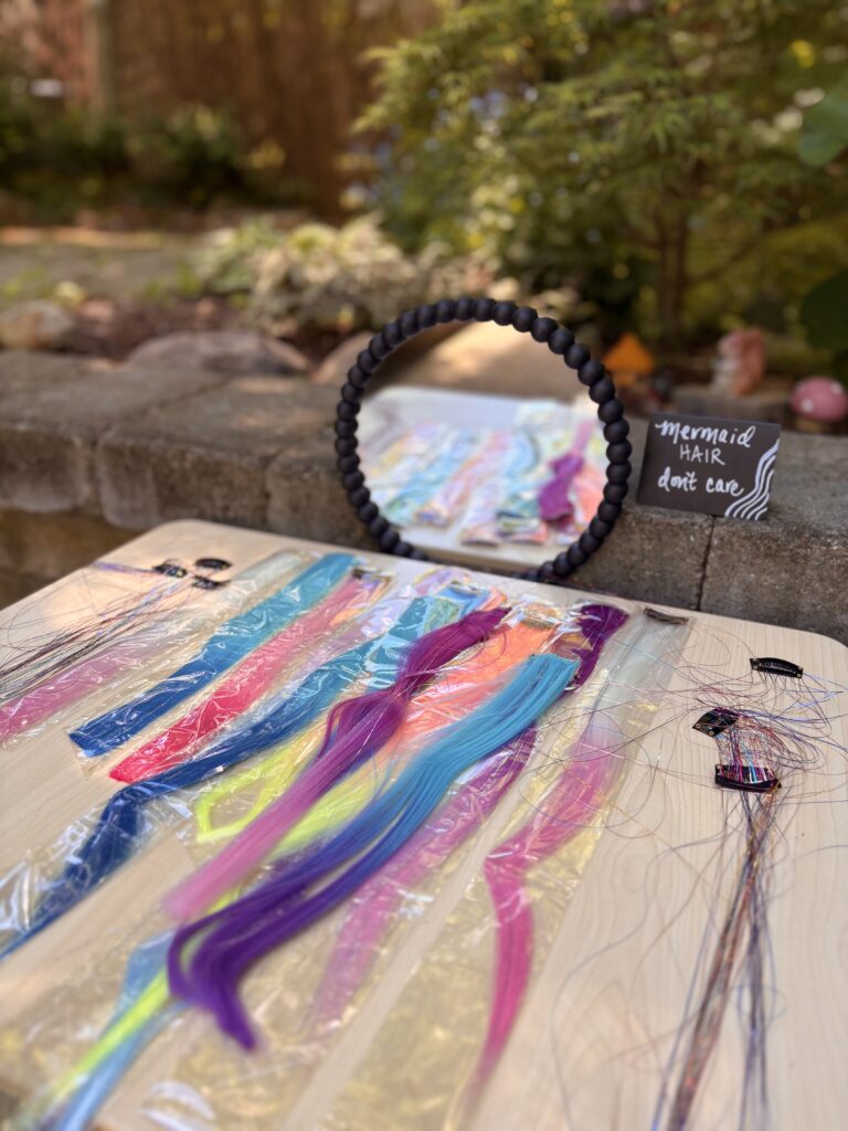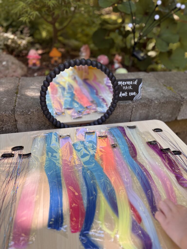 We had a “Mermaid hair don’t care” table with colorful hair extensions and rainbow hair tinsel. The girls LOVED playing with these!