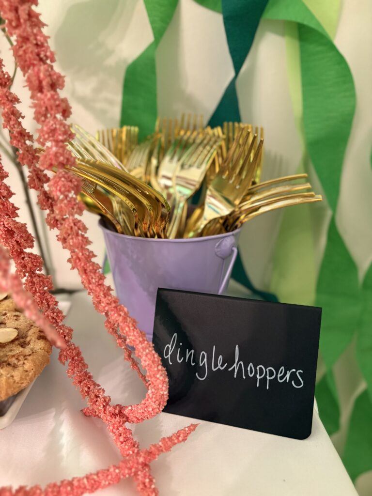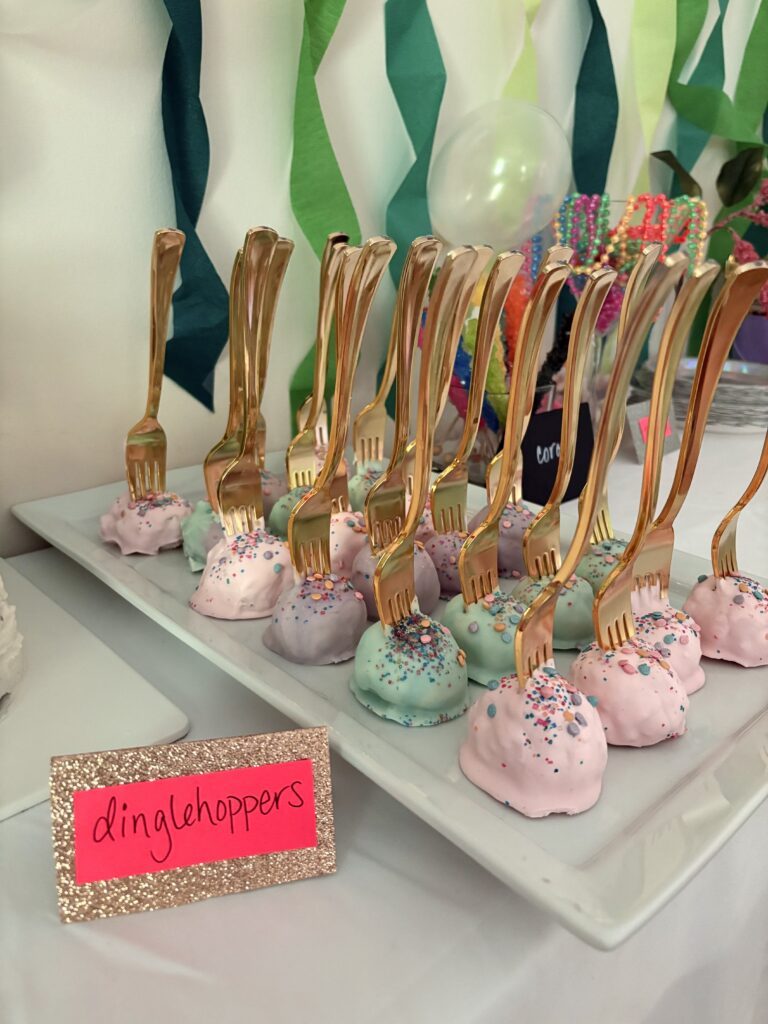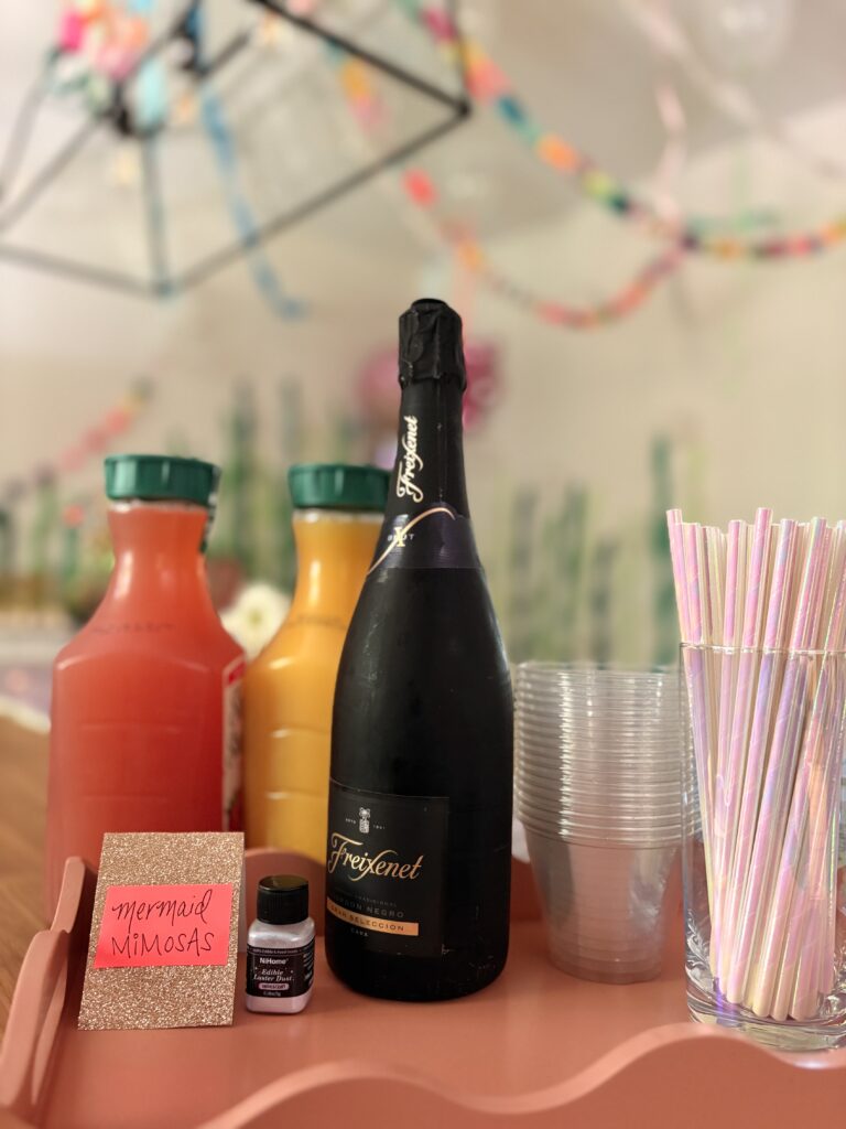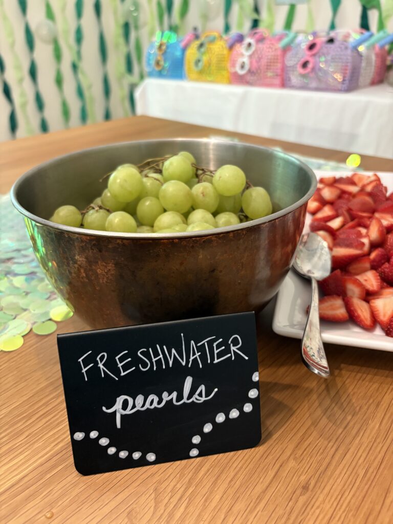 We had a “Mermaid hair don’t care” table with colorful hair extensions and rainbow hair tinsel. The girls LOVED playing with these!
