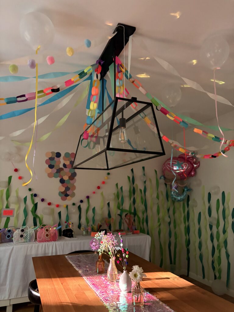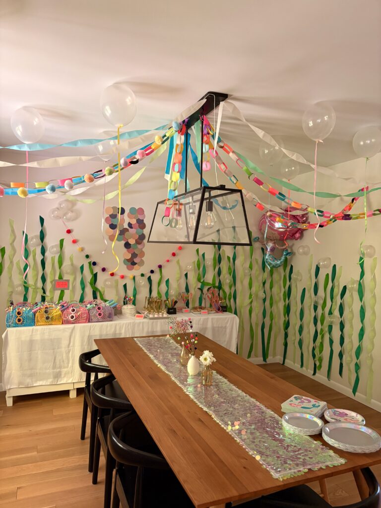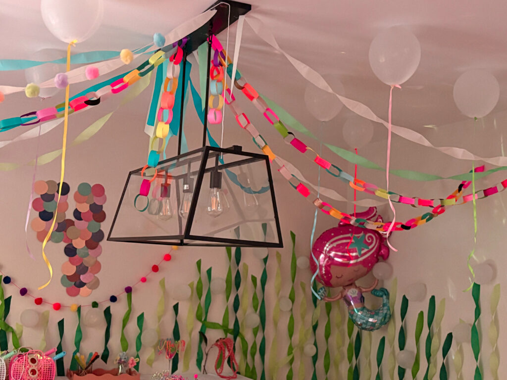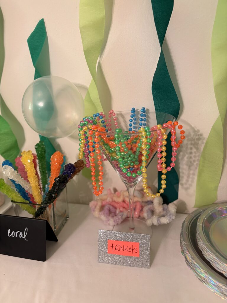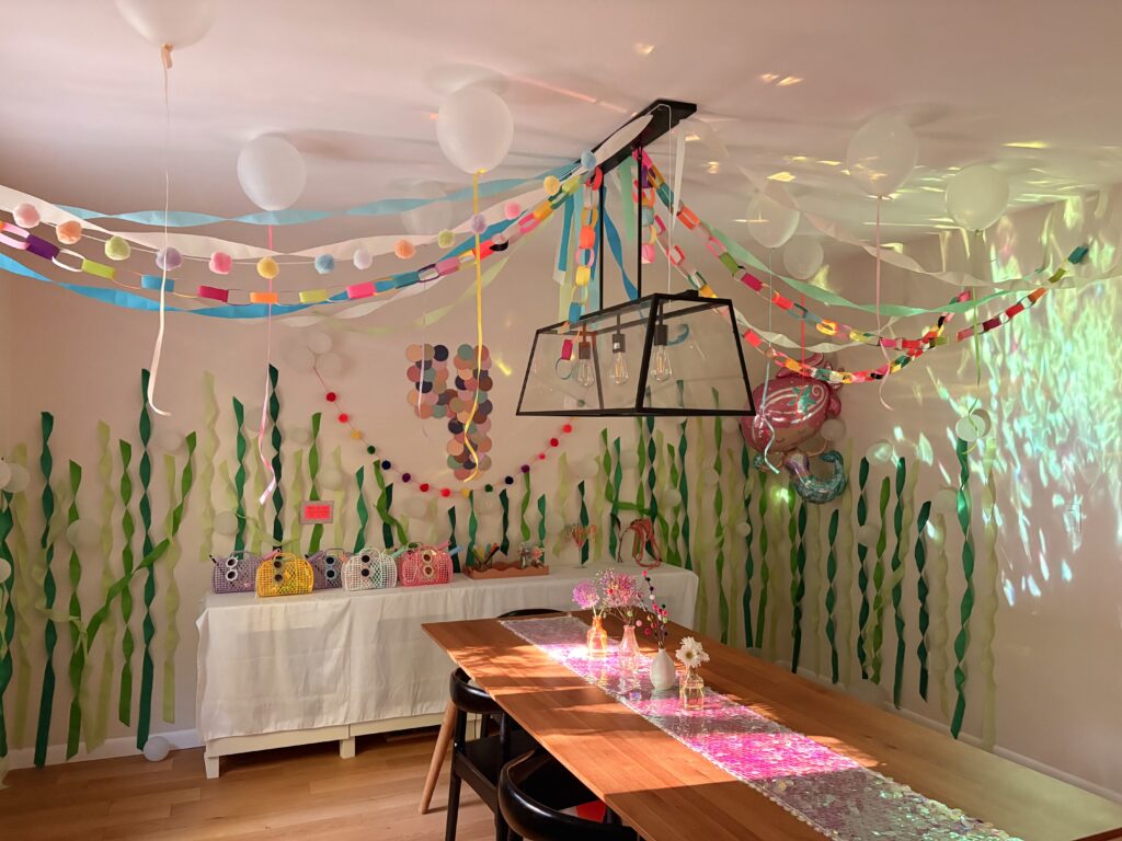 For my daughter’s 4th birthday we did a “Four on the Ocean Floor” themed party. I included my Amazon affiliate links for the items used throughout (commission based). This was probably one of my favorite DIY parties I’ve done, we had a lot of fun with the ocean theme and iridescent colors.