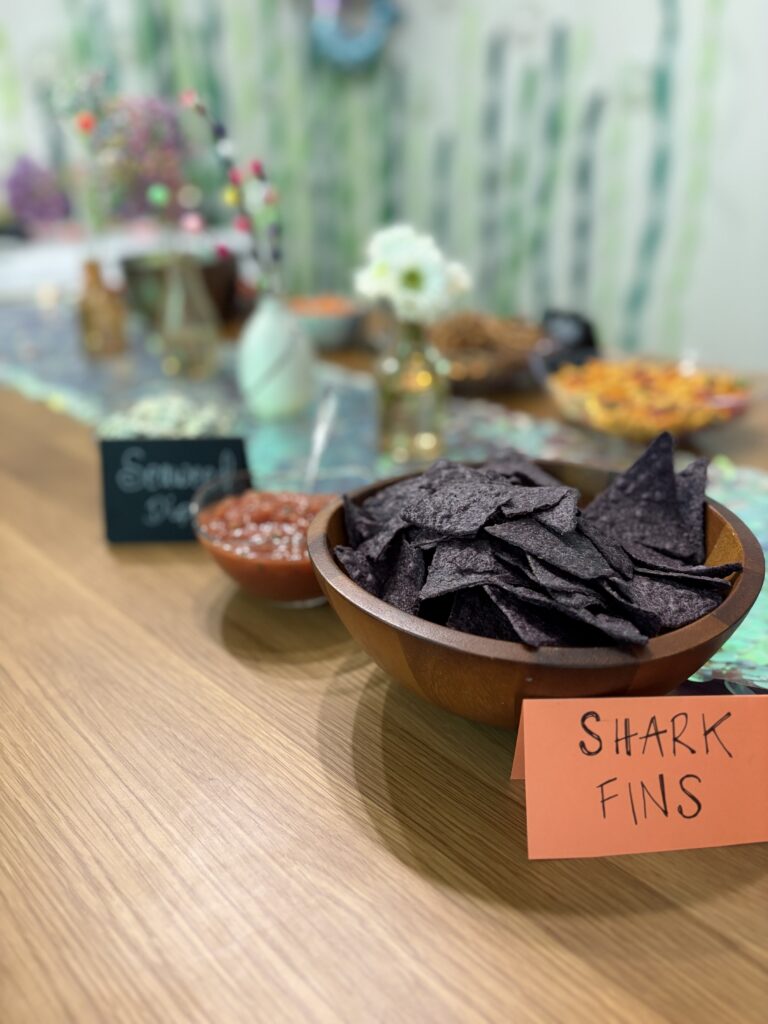 For the main room, I decorated the walls with green paper streamers for the seaweed look, and used clear balloons and balloon tape for the bubbles. The 30 inch mermaid balloon and blue paper streamers for the underwater effect and I made pom pom ball and paper chain link streamers. The long iridescent mermaid scale table runner added a fun glittery effect.
